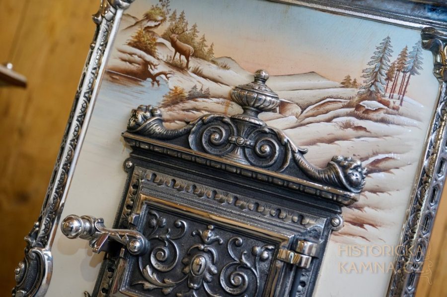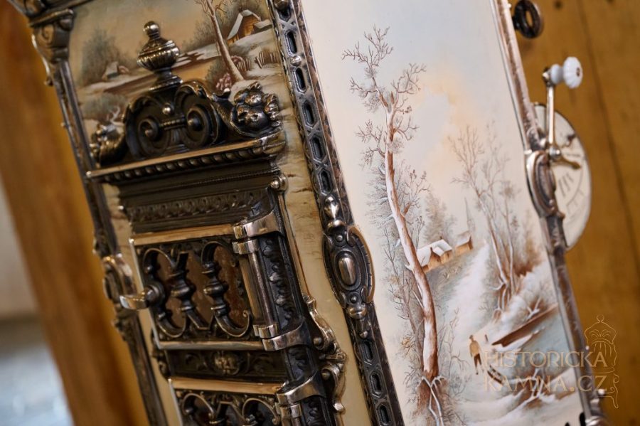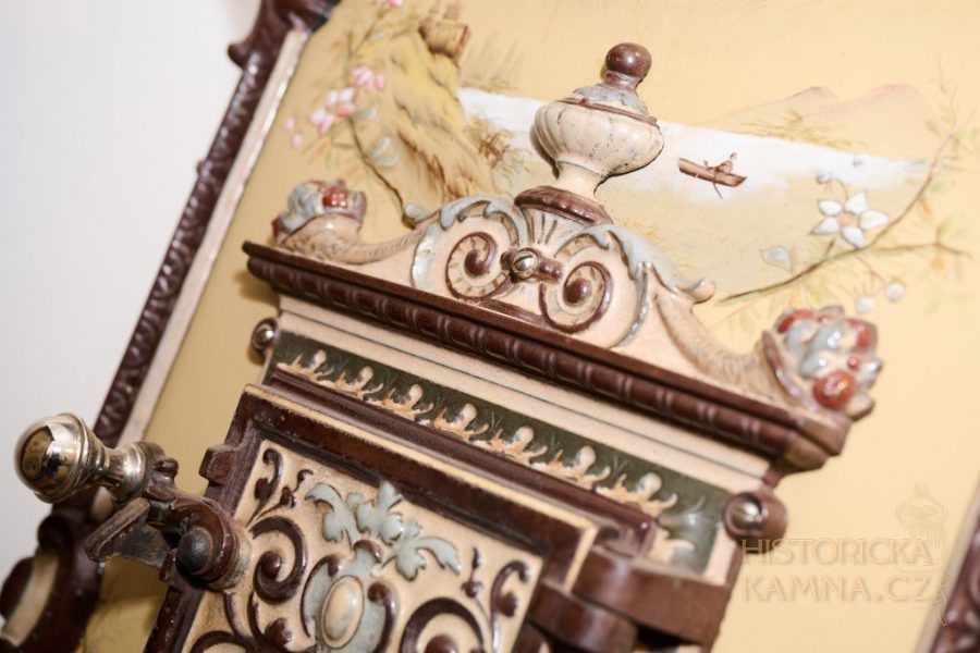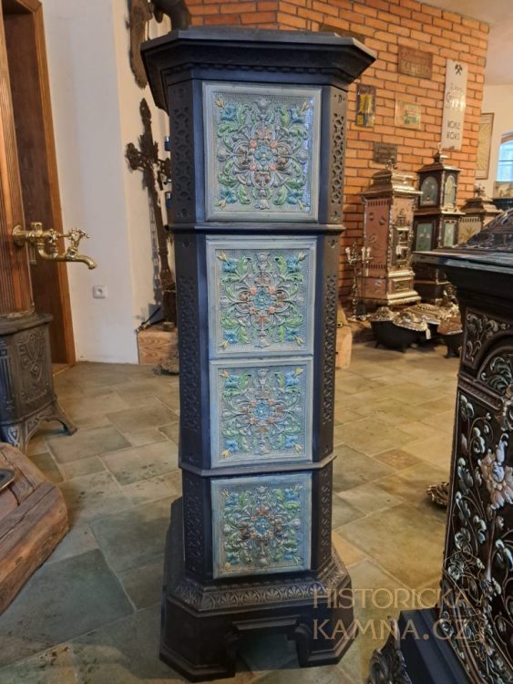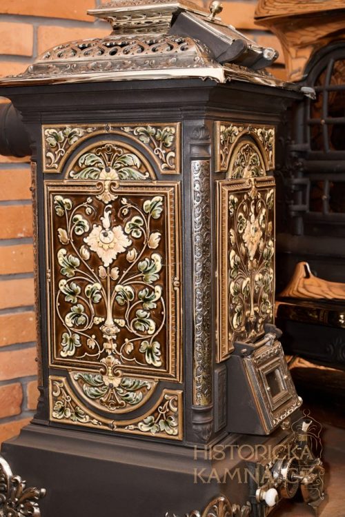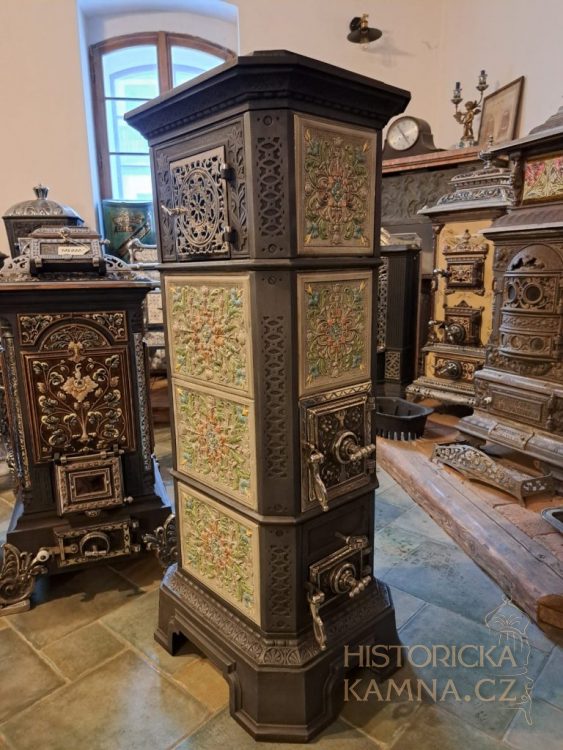 Kamna značky Ilsenburg Huttenamt bohatě zdobená keramikou.