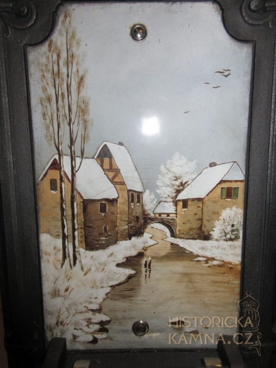 Německá kamna Harz Nr.160, perfektně zachovalé smaltované obrázky ze třech stran.