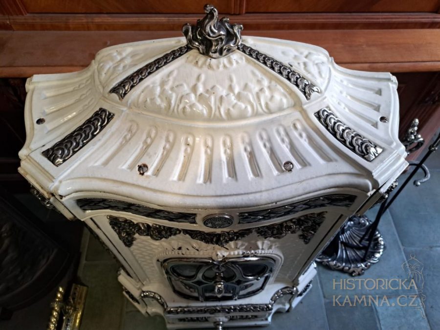 Francouzská krbová kamna v původním bílém smaltu se značným množství poniklovaných zdobných prvků.