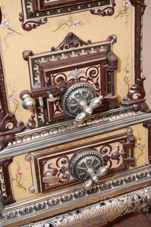 F. Kuppersbusch und Sohne, Schalke cca 1900 – 1905, perfektně zachovalá malovaná smaltovaná úprava.